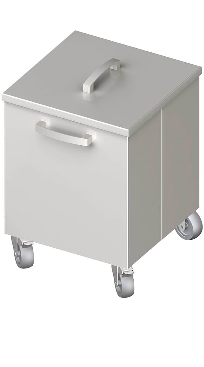 Abfallbehälter fahrbar H = 500mm hergestellt aus rostfreiem, ferritischem Stahl mit einem seitlichen Tragegriff vier Lenkrollen, zwei mit Feststeller Volumen 40 L fest verschweißte Ausführung