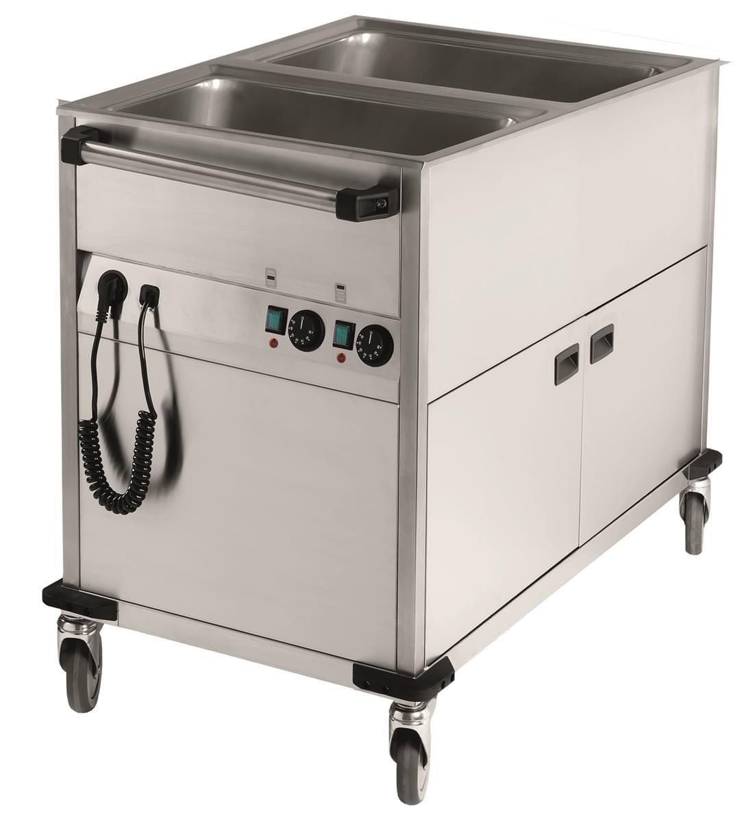 Bain-Marie Wagen 2 x GN 1/1 mit beheiztem Unterschrank (schmal) Der Bain-Marie Wagen 2 x GN 1/1 mit beheiztem Unterschrank ist eine kompakte und mobile Warmhaltestation für professionelle Gastronomiebetriebe, Catering-Services und Großküchen. Mit seiner robusten Edelstahlkonstruktion, präzisen Temperaturregelung und flexiblen Mobilität eignet er sich perfekt zur Speisenlagerung und -ausgabe. Technische Details Maße: 650 x 900 x 900 mm (BxTxH) Anschluss: 230V, 1,4 + 0,8 kW Material: Edelstahl Temperaturbereich: +30° bis +90° regelbar Kapazität: 2 Becken für GN 1/1 Einsätze (Tiefe: 200 mm) Beheizter Unterschrank für zusätzlichen Stauraum Funktionale Ausstattung Kontrollleuchten für Betrieb & Heizung für eine sichere Nutzung Hauptschalter zur einfachen Steuerung Bedienelemente an der kurzen Seite für eine platzsparende Bedienung Abflusshahn (2x) für einfaches Entleeren und Reinigen 4 Lenkrollen für eine einfache Mobilität Einsatzbereiche Der Bain-Marie Wagen 2 x GN 1/1 mit beheiztem Unterschrank eignet sich ideal für: Gastronomiebetriebe und Buffets Catering-Services und Kantinen Krankenhäuser, Hotels und Großküchen Dank seiner kompakten Bauweise, hochwertigen Materialien und mobilen Nutzungsmöglichkeiten ist dieser Bain-Marie Wagen die perfekte Lösung für professionelle Küchen, die eine effiziente und flexible Warmhaltestation benötigen.