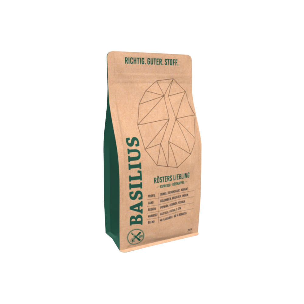 Basilius Espresso: Rösters Liebling (1000g)Intensität:Säure:Röstung:Profil:Edelbitter, NougatBasilius Espresso: Rösters LieblingWahrscheinlich ist es keine Überraschung, dass auch bei in der Basilius Kaffeerösterei der Blend „Rösters Liebling“ eine Espressoröstung ist. Einen Espresso weiß schließlich jeder Kaffeefreund zu schätzen. Mit 60%-Robustaanteil ist diese Röstung ein geradezu typischer Espresso, dessen kräftige Note von zwei unterschiedlichen Arabicas abgerundet wird. Während der kolumbianische Hochlandkaffee dabei für eine angenehm schokoladige Note sorgt, bringt der brasilianische Arabicabestandteil etwas spürbar nussiges mit. Insgesamt entsteht so ein unvergleichlicher Espresso, der bestimmt auch Ihr Liebling werden kann.ZubereitungsempfehlungenAm besten geeignet für:SiebträgerKaffeevollautomatLieferumfang: 1x 1000g Rösters Liebling von Basilius KaffeeBasilius Kaffee bei Kaffe…