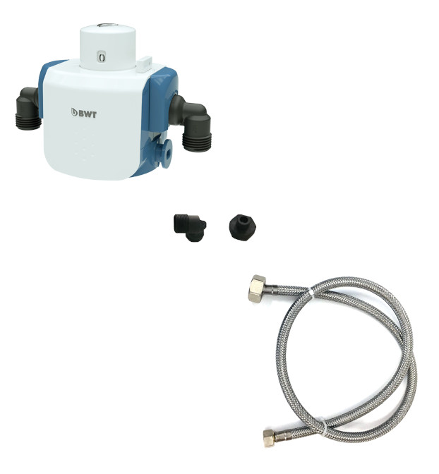 BWT Anschluss Set besthead Flex 2 – HFDas Set eignet sich sowohl für die Erstinstallation einer neuen Filterkerze, als auch für den Austausch für vorhandene Filterköpfe die älter als 5 Jahre sind. Das neue High-Flow Set ist speziell für den Einbau in der Spültechnik mit den BWT Voll,- und Teilentsalzungspatronen BWT bestclear und Extra entwickelt. Lieferumfang:1x BWT besthead FLEX (Filterkopf) mit 2 Anschlussstücken gerade, AG 3/4"" 1x Anschlussschlauch IG 3/8"" x IG 3/4"", DN 10, 1500 mm 1x Anschlussstück 90°-?Bogen, FLEX Insert x AG 3/4"" aus GFK 1x Reduzierung IG 3/4"" x AG 3/8"" aus GFK