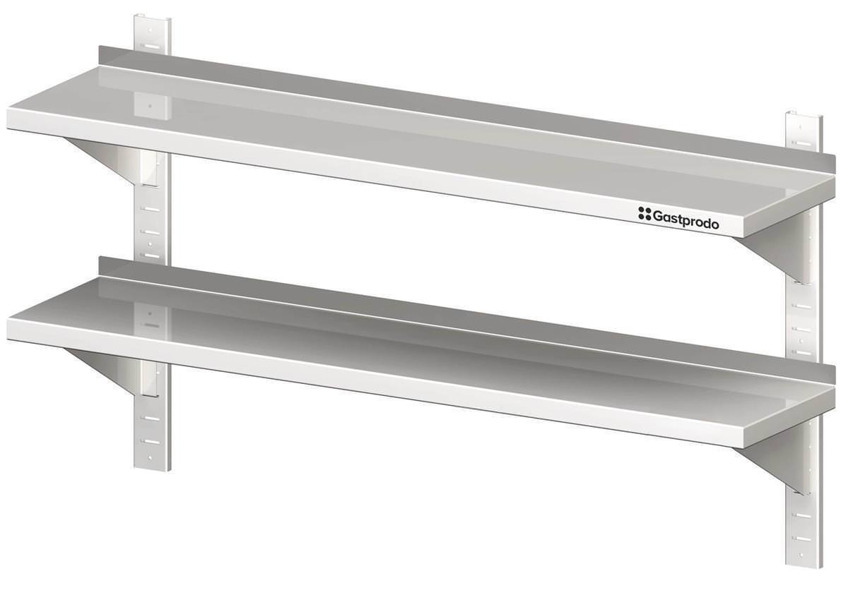 Doppel Edelstahl Wandregal / Wandboard mit Konsolen, und Wandschienen, 800x400x660 mm, höhenverstellbar, verschweißt hergestellt aus rostfreiem, ferritischem Stahl Höhe 660 mm Aufkantung hinten, 30 mm Höhe ab einer Breite von 1400 mm mit drei Konsolen und Wandschienen ausgestattet