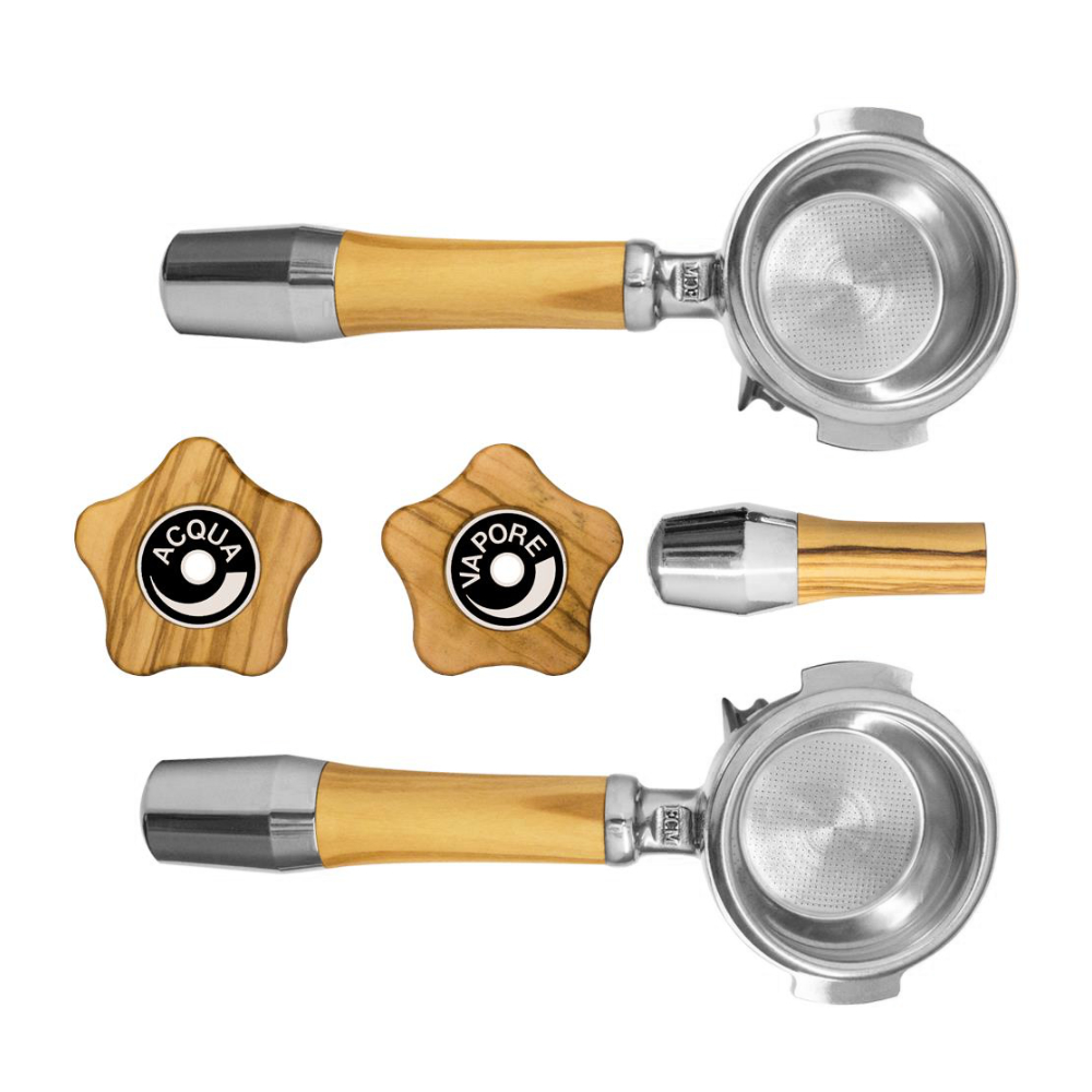 Griffset für Drehventil Maschinen – ECM Griffset Olivenholz Ausführung bestehend aus je 1x Filterträger, 1x Auslauf, 2 Ausläufe sowie dem Bezugshebel und 2 Drehhebel: 1x ECM Filterträger Edelstahl 1 Auslauf ""Olivenholz Griff"" 1x ECM Filterträger Edelstahl 2 Ausläufe ""Olivenholz Griff"" 1x Hebel Gruppe M8 Chrom ""Olivenholz Griff"" 2x Drehgriff ""Olivenholz Griff"" 1x Heißwassergriffscheibe ""Aqua"" Schwarz 1x Dampfgriffscheibe ""Vapore"" Das Ersatzteil passt in folgende Modelle: ECMDrehhebel Espressomaschinen von ECM Sie wissen, Holz ist ein Naturprodukt. Daher unterscheidet sich jedes Teil vom anderen. Eine Vorauswahl können wir aber leider nicht anbieten.