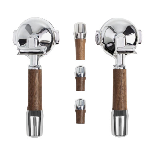 Griffset für Kipphebel Maschinen, ECM Synchronika Nussholz Die Griffe dieses Sets sind aus Nussholz gefertigt.Lieferumfang: 2 Siebträger inkl. Griffstück, Endkappe und Siebträgerkopf 2 Kipphebel inkl. Endkappe1 Bezugshebel inkl. Endkappe