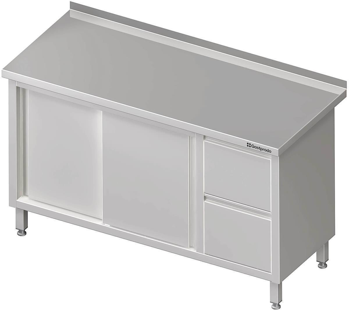 Edelstahlschrank / Edelstahl Arbeitsschrank mit Schiebetüren, 1900x600x850 mm, mit 2er Schubladenblock rechts, mit Aufkantung, verschweißt Der Edelstahlschrank / Edelstahl Arbeitsschrank mit Schiebetüren, 1900x600x850 mm, mit 2er Schubladenblock rechts, mit Aufkantung, verschweißt liefert eine ruhige, stabile Arbeitsplattform und Ordnung auf mehreren Ebenen in 1900x600x850 mm. Zusätzliche Details in der Bauform sorgen für Effizienz und Sicherheit im Alltag. Merkmale Material: hochwertiger Edelstahl mit glatter Oberfläche – langlebig, hygienisch und pflegeleicht Arbeitsplatte: ca. 40 mm starke Platte, unterfüttert mit doppelt laminierter Schallschutzplatte für geräuscharmes Arbeiten; rückseitige Aufkantung 100 mm für Spritz- und Sauberschutz Konstruktion: verschweißte Profi-Konstruktion für maximale Stabilität; Tischbeine aus Vierkantprofil 40 × 40 mm; höhenverstellbare Füße (−5 mm bis +25 mm) für sicheren Stand Vorteile pflegeleicht & korrosionsbeständig: glatte Edelstahlflächen für schnelle, gründliche Pflege. torsionssteif & solide: solide Konstruktion für den harten Dauereinsatz. Mehr Bewegungsfreiheit: offener Unterbau erleichtert das Unterfahren und Reinigen. Anwendungsbereiche Gastronomie & Großküchen: strukturierte Mise en Place und saubere Prozesse. Werkstatt & Handwerk: stabile Arbeitsbasis für anspruchsvolle Tätigkeiten. Labor & Produktion: hygienische Edelstahlflächen für sensible Bereiche. Setzen Sie auf eine Arbeitsstation, die Beinfreiheit und Unterfahrbarkeit priorisiert und zugleich pflegeleicht & korrosionsbeständig bleibt. Die geräuschdämpfende 40 mm Arbeitsplatte fördert konzentriertes, leises Arbeiten, während die 40 × 40 mm Unterkonstruktion auch bei hoher Belastung formstabil bleibt. Ob mise en place in der Profi-Küche, Feinmontage in der Werkstatt oder Probenvorbereitung im Labor – die Kombination aus Ordnung, torsionssteif & solideer Bauweise und kurzen Wegen unterstützt sichere Abläufe. Konfiguration starten und setzen Sie auf faire Konditionen: Wählen Sie Maße und Ausstattung nach Bedarf und machen Sie Ihre Abläufe messbar effizienter.