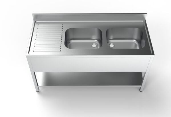 Edelstahl Spültisch PRO mit Grundboden 160 x 70 cm – 2 Becken rechts