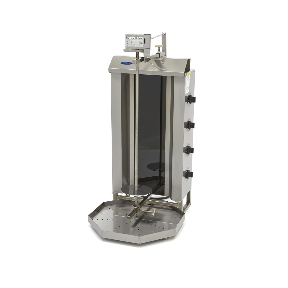 Maxima Döner Kebab / Gyros / Shoarma Grill 4 Brenner – Elektrisch Dieser hochwertige Grill verfügt über 4 elektrische Brenner, Motor oben. Der Grill ist ideal, um leckere Döner, Gyros, Kebab oder Döner zuzubereiten. Standard mit Edelstahl-Tropfschale mit Filter ausgestattet. Professioneller Grill für Döner / Gyros / Kebab / Shawarma Ausgestattet mit 4 elektrischen Brennern mit Robax-Schutzglas Die Temperatur kann für jeden Brenner individuell eingestellt werden Exklusive seitlichen Reflektionsschirmen aus Edelstahl Ausgestattet mit Tropfschale aus Edelstahl mit Filter Gehäuse, Spieß und Fleischplatte aus Edelstahl Zuverlässiger Motor an der Spitze Grillspieß ist für die perfekte Zubereitung verstellbar Der Spieß kann sich nach links und rechts drehen Einfach zu säubern Max. Kapazität: 50 kg Fleisch Abmessungen Spieß: 12 x 12 mm Spießlänge: 770 mm Drehzahlspieß: 1 Umdrehung pro Minute Durchmesser Fleischplatte: 190 mm Nettogewicht: 31 kg Abmessungen: B545 x T691 x H1142 mm 400V/50Hz/3Phase 6800 Watt