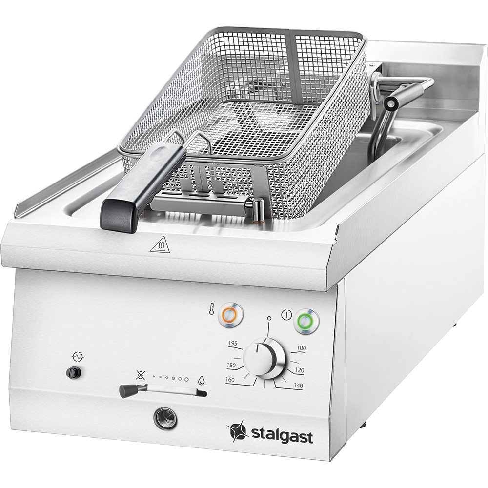 Stalgast 700 ND Elektro Fritteuse 10 Liter neues Design ergonomische Knebel Lasergraviertes Bedienfeld Kontrollleuchten für Betrieb und Stromversorgung automatische Abschaltung nach Entfernung der Heizelemente Sicherheitsthermostat klappbare Heizelemente für eine leichtere Reinigung mit Ablasshahn gegen Aufpreis: zwei kleine Fritteusenkörbe für Fritteusen Einzel-Fritteuse 400 x 700 x 250 mm (BxTxH) Inhalt: 10 Liter Elektrische Leistung: 9 kW Spannung: 400 Volt