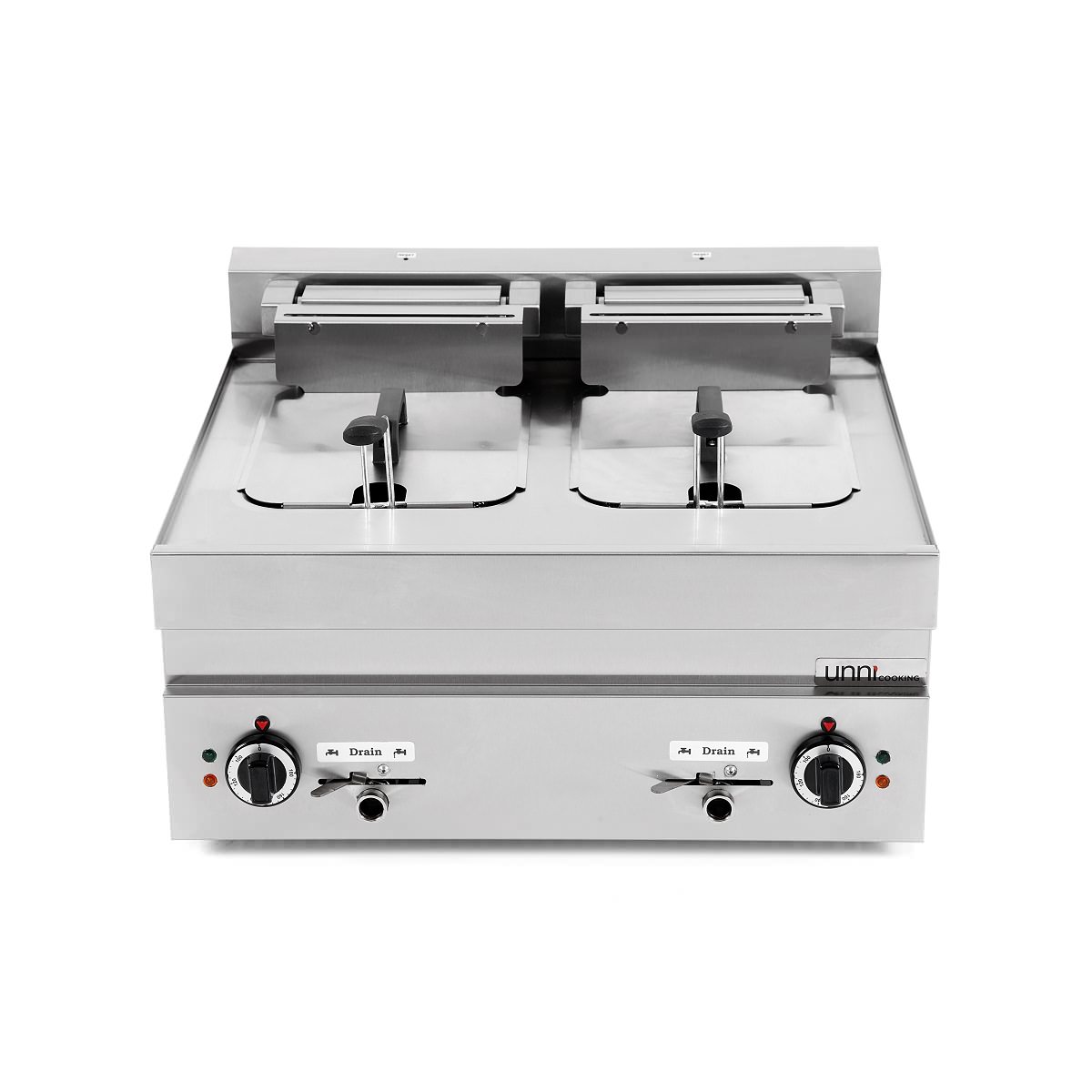 Elektro Fritteuse PRO – 2x 10 Liter Abmessung der Wanne: 250 x 370 x 210 mm (BxTxH) Korbgröße: 220 x 300 x 110 mm (BxTxH) Ölkapazität: min 9 Liter, max. 10 Liter pro Becken aus Edelstahl AISI 304 mit Kaltzone mit Ablassventil durchschnittliche Frittierzeit: 6 Minuten Temperatur: 100-180 Grad Gewicht: 46 kg 400 V Leistung: 15 kW Entdecken Sie die leistungsstarke elektrische Fritteuse aus der 650 LINE von UnniCooking. Dieses Modell ist in zwei Varianten erhältlich: 1×10 Liter oder 2×20 Liter. Die Fritteuse wurde speziell entwickelt, um Ihnen selbst während der geschäftigsten Momente perfekte Pommes Frites zu liefern. Mit ihrer beeindruckenden Geschwindigkeit und Kapazität ermöglichen sie Ihnen mühelos die Zubereitung großer Mengen knuspriger Pommes Frites. Die Fritteuse ist mit praktischen Funktionen ausgestattet, wie einem Thermostat, einem integrierten Ablasshahn, einem Ein-/Aus-Schalter und einer Kontrollleuchte. Darüber hinaus verfügt sie über eine Kaltzone, die für eine bessere Ölqualität sorgt und verhindert, dass Lebensmittelreste verbrennen.