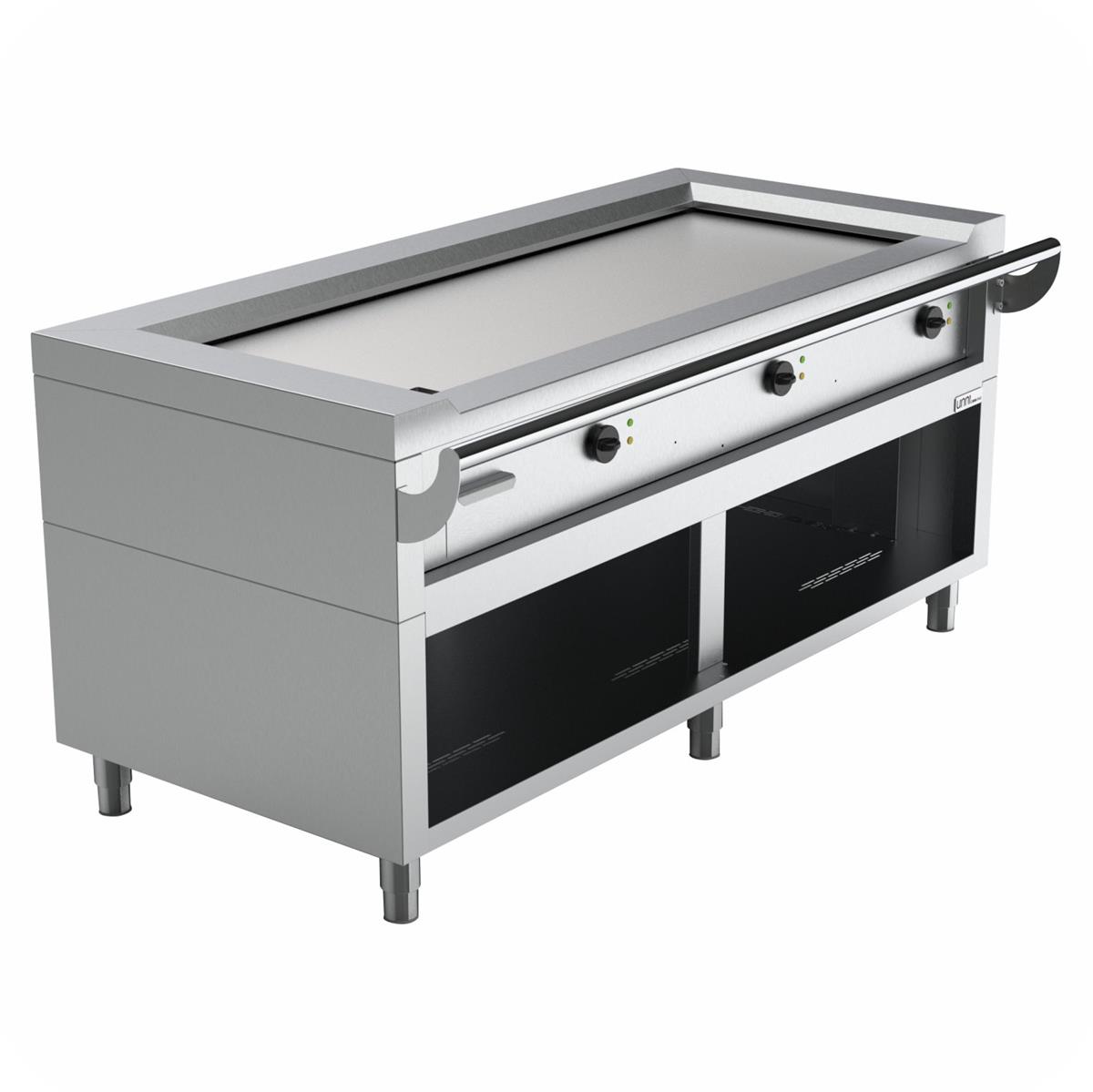 Elektro Teppanyaki Grill – 3 Heizonen Aus Edelstahl 20 mm dicke Grillplatte aus poliertem Weichstahl Mit elektrische Widerstandsheizelement 400V Einstellbarer thermostat mit einem temperaturbereich von 50 °C bis 300 °C Mit Sicherheitsthermostat und thermoelement Isolierung der Vorrichtung, mit der Wärmeableitung auf drei Seiten Oberseite mit 40 mm hitzebeständiger Isolierung Hat 1 Aussparung im teppanyaki oberteil zum sammeln und entfernung von Fetten Mit Sicherheitsschiene an der Vorderseite ausgestattet Unterbau offen Leistung: 13,5 kW Maße: 1740 x 770 (mit Griff 890 mm) x 850 mm (BxtxH)