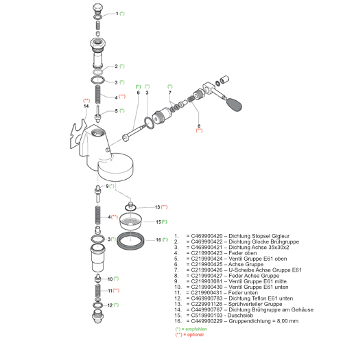 Dichtungssatz E61 Brühgruppe HaushaltRevisionsset für E61 Brühgruppen bei Haushaltsgeräten. Wählen Sie aus den Listen einfach die Teile aus, die Sie benötigen.Ihren Dichtungssatz können Sie aus folgenden Ersatzteilen zusammenstellen:1 = Dichtung Stöpsel Gigleur2 = Dichtung Glocke Brühgruppe3 = Dichtung Achse 35 x 30 x 24 = Feder oben5 = Ventil Gruppe E61 oben6 = Achse Gruppe7 = U-Scheibe Achse Gruppe E61*8 = Feder Achse Gruppe9 = Ventil Gruppe E61 mitte10 = Ventil Gruppe E61 unten11 = Feder unten12 = Dichtung Teflon E61 unten13 = Sprühverteiler Gruppe14 = Dichtung Brühgruppe am GehäuseLieferumfang: 1x Revisionsset bestehend aus den gewählten TeilenDer Dichtungssatz passt in folgende Modelle:Alle Haushaltssiebträger mit E61 Brühgruppe