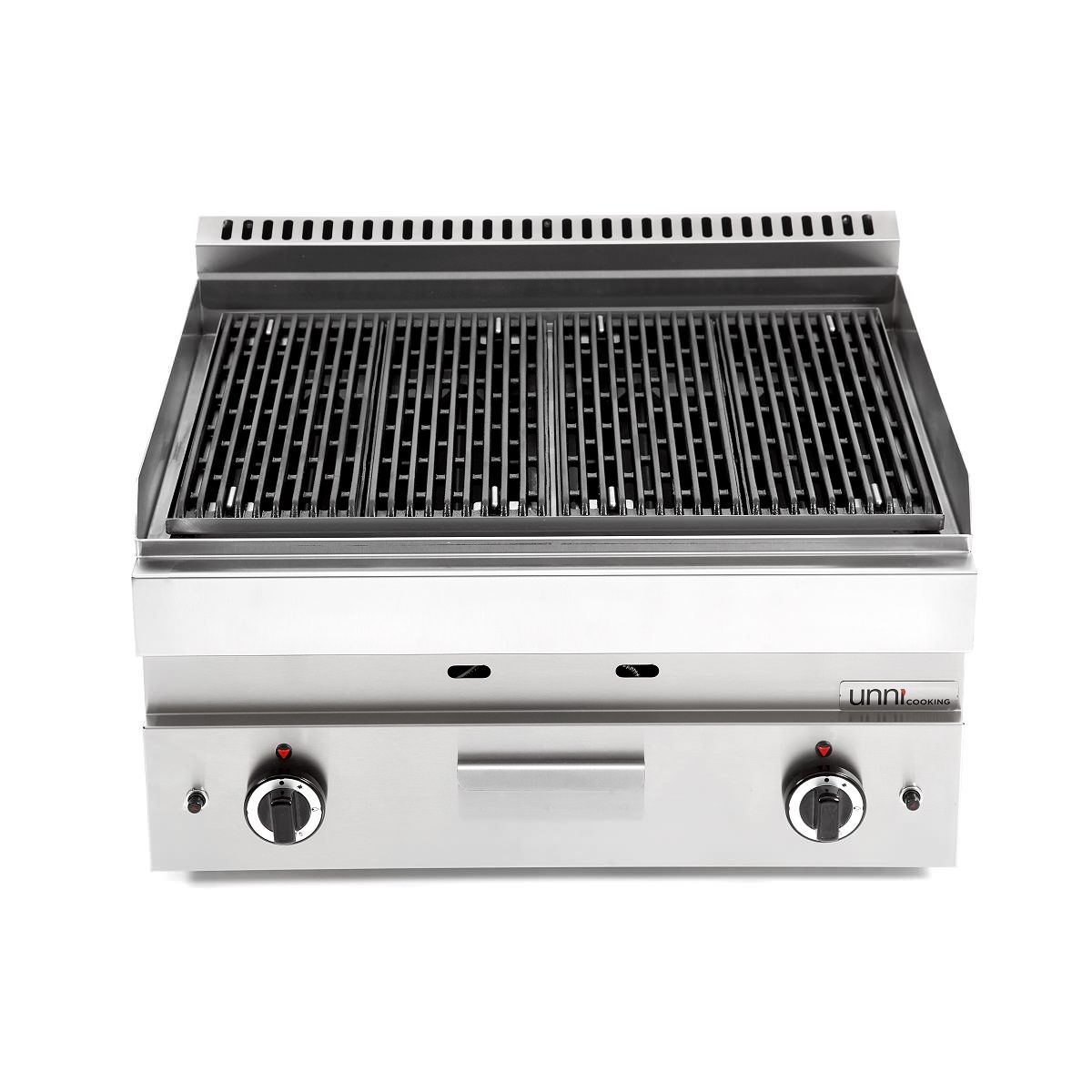 Gas Lavasteingrill Pro – 2 Heizzonen Bratrost aus Gusseisen Höhenverstellbarer Bratenrost Frontseitige Auffangschale zur Rückgewinnung von Kochsäften Gasheizung durch Edelstahlbrenner mit stabiler Flamme Temperaturregelung durch Gashahn Leistung: 2x 5,5 kW Maße: 700 x 650 x 300 mm (BxTxH) Gasanschluss: 1/2 Zoll Tauche ein in die Welt der kulinarischen Perfektion mit dem UnniCooking 650 LINE Lavasteingrill, wo die Kochkunst auf ein neues Level gehoben wird. Dieser Grill wurde speziell entwickelt, um deine kulinarischen Kreationen auf neue Höhen zu bringen und bietet ein effizientes und vielseitiges Kocherlebnis, wodurch er die ideale Wahl für Restaurants, Cafés und andere gastronomische Einrichtungen ist, die nur das Beste anstreben. Der UnniCooking 650 LINE Lavasteingrill ist mit fortschrittlicher Technologie ausgestattet, die das Kocherlebnis auf ein neues Niveau bringt. Der leistungsstarke Edelstahlbrenner mit stabilisiertem Flammenbild und Piezozündung sorgt für eine zuverlässige und gleichbleibende Hitze. Mit dem einfach einstellbaren robusten Drehknopf hast du die volle Kontrolle über die Hitze, sodass du deine Gerichte perfekt zubereiten kannst. Der Lavasteingrill macht das Grillen zu einem wahren Genuss, egal ob du Fleisch, Fisch oder Gemüse zubereiten möchtest. Die Lavasteine sorgen für eine gleichmäßige Wärmeverteilung und verleihen deinen Gerichten einen authentischen, rauchigen Geschmack, der deine Gäste von der köstlichen Aromenvielfalt begeistern wird. Mit dem UnniCooking 650 LINE Lavasteingrill kannst du deine kulinarische Vision zum Leben erwecken und selbst die anspruchsvollsten Feinschmecker zufriedenstellen. Dieser Grill wurde gebaut, um Leistung, Langlebigkeit und Zuverlässigkeit zu bieten, damit du mit Zuversicht kochen und immer wieder perfekte Ergebnisse erzielen kannst.