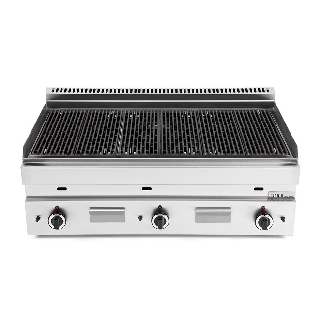 Gas Lavasteingrill Pro – 3 Heizzonen Bratrost aus Gusseisen Höhenverstellbarer Bratenrost Frontseitige Auffangschale zur Rückgewinnung von Kochsäften Gasheizung durch Edelstahlbrenner mit stabiler Flamme Temperaturregelung durch Gashahn Leistung: 3x 5,5 kW Maße: 1100 x 650 x 300 mm (BxTxH) Gasanschluss: 1/2 Zoll Tauche ein in die Welt der kulinarischen Perfektion mit dem UnniCooking 650 LINE Lavasteingrill, wo die Kochkunst auf ein neues Level gehoben wird. Dieser Grill wurde speziell entwickelt, um deine kulinarischen Kreationen auf neue Höhen zu bringen und bietet ein effizientes und vielseitiges Kocherlebnis, wodurch er die ideale Wahl für Restaurants, Cafés und andere gastronomische Einrichtungen ist, die nur das Beste anstreben. Der UnniCooking 650 LINE Lavasteingrill ist mit fortschrittlicher Technologie ausgestattet, die das Kocherlebnis auf ein neues Niveau bringt. Der leistungsstarke Edelstahlbrenner mit stabilisiertem Flammenbild und Piezozündung sorgt für eine zuverlässige und gleichbleibende Hitze. Mit dem einfach einstellbaren robusten Drehknopf hast du die volle Kontrolle über die Hitze, sodass du deine Gerichte perfekt zubereiten kannst. Der Lavasteingrill macht das Grillen zu einem wahren Genuss, egal ob du Fleisch, Fisch oder Gemüse zubereiten möchtest. Die Lavasteine sorgen für eine gleichmäßige Wärmeverteilung und verleihen deinen Gerichten einen authentischen, rauchigen Geschmack, der deine Gäste von der köstlichen Aromenvielfalt begeistern wird. Mit dem UnniCooking 650 LINE Lavasteingrill kannst du deine kulinarische Vision zum Leben erwecken und selbst die anspruchsvollsten Feinschmecker zufriedenstellen. Dieser Grill wurde gebaut, um Leistung, Langlebigkeit und Zuverlässigkeit zu bieten, damit du mit Zuversicht kochen und immer wieder perfekte Ergebnisse erzielen kannst.