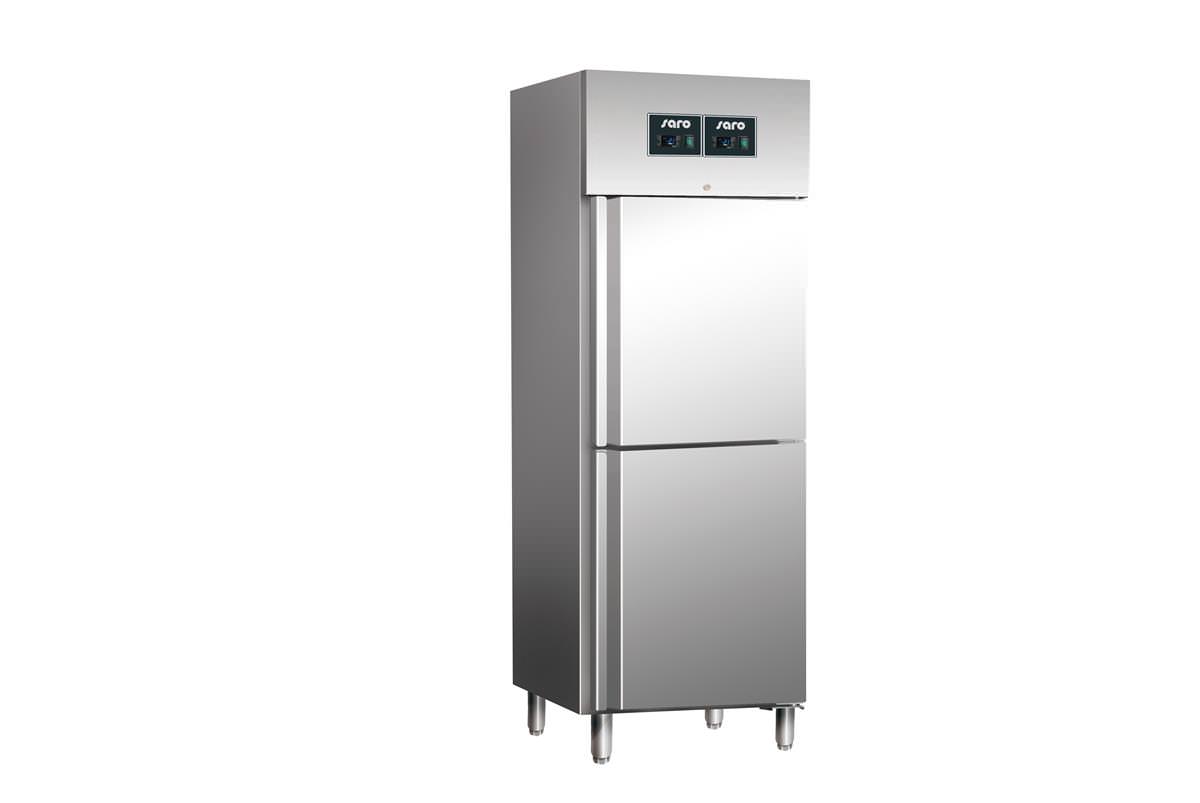 Gewerbe-Kühl/Gefrierkombination Modell GN 60 DTV Material: (Gehäuse und Innenraum) Edelstahl Türen selbstschließend, abschließbar 4 höhenverstellbare Roste Digitale Temperaturregelung (DIXELL) Isolierung: 60 mm Umluftkühlung Automatische Abtauung Temp. -2 / +8 und -18 / -22 °C Anschluss: K: 230 V – 50 Hz – 0,300 kW, T: 230 V – 50 Hz – 0,600 kW Roste: 4x B 540 x T 630 mm Inhalt: 2x 129 Liter Innenmaße: 2x B 560 x T 680 x H 650 mm Außenmaße: B 680 x T 845 x H 2010 Gewicht: 191 kg Kältemittel: R600a/R290