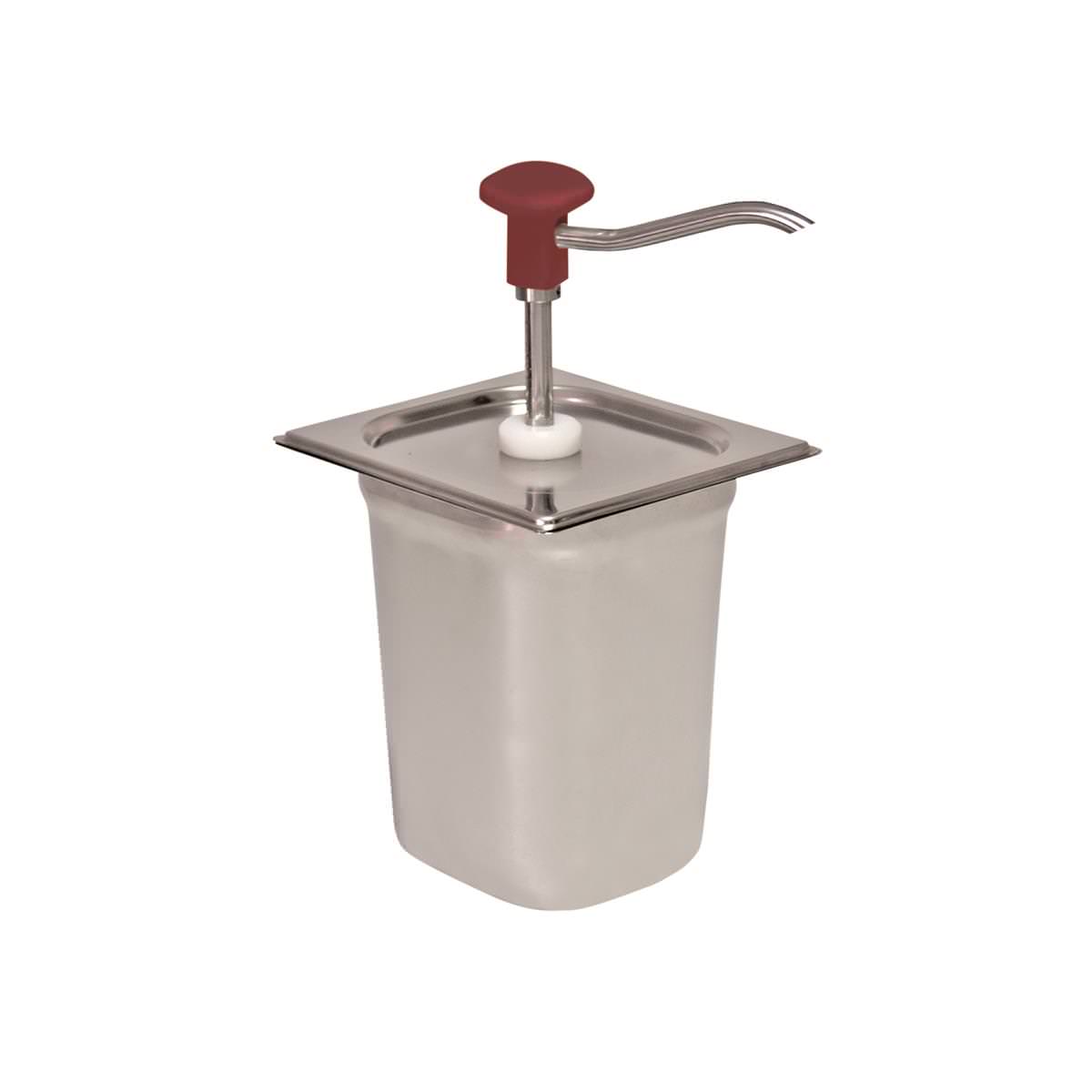 GN-Edelstahl- Pumpspender für Soßen rot Fassungsvermögen: 3 Liter mit Druckknopf-Bedienung Behälter aus Edelstahl (GN1/6) Dosierung einstellbar (30ml) Maße: 180 x 165 x 330 mm Farbe: Rot