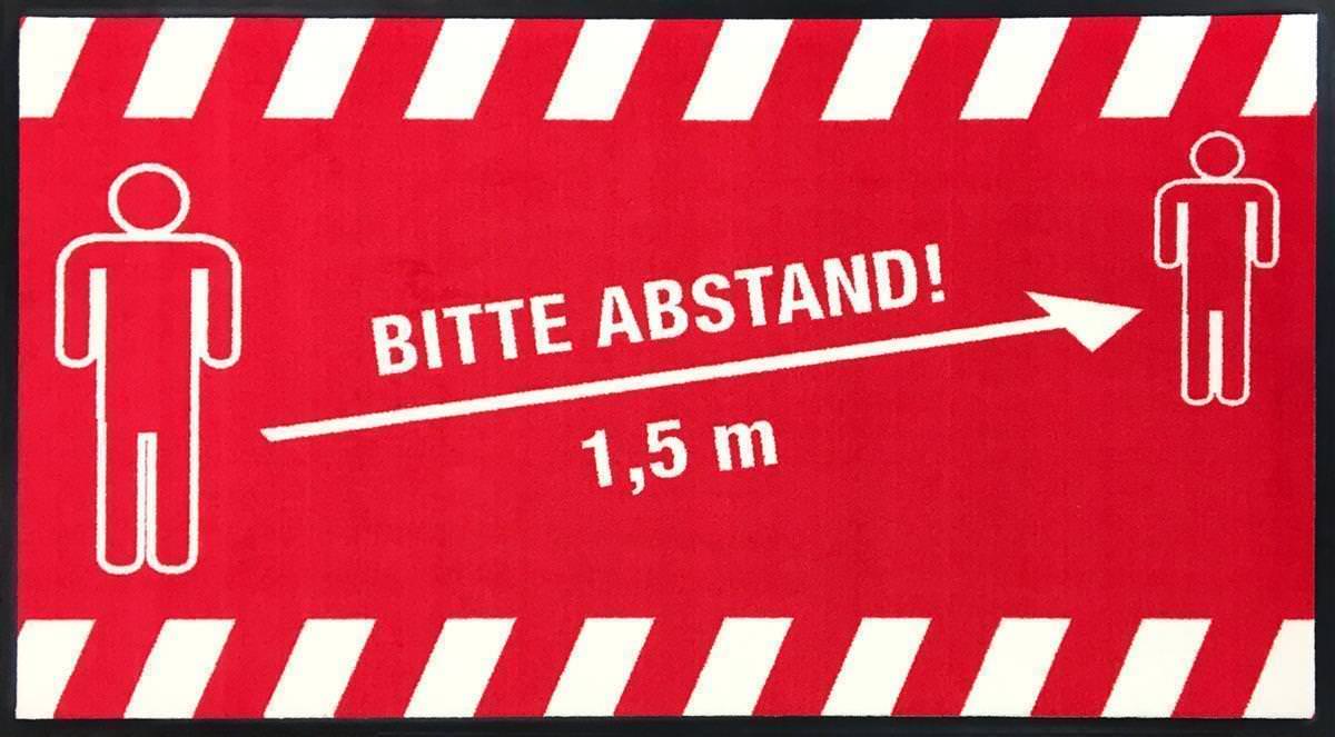 Hinweismatte “Bitte Abstand!” 150 x 85 cm Unsere Hinweismatten weisen auffallend auf die neuen Sicherheitsbestimmungen hin. Außerdem halten sie Ihren Kundenbereich sauber. Unsere Hinweismatten sind sofort lieferbar. Sie benötigen andere Maße? Sie möchten Ihren eigenen Druck auf der Matte haben? Kein Problem wir bieten individuelle Gestaltung in allen Größen, Formen & Farben (Druck mit 32 aus 32 Standardfarben) an. Rufen Sie uns einfach an! Anwendungsbereiche Stark frequentierte Eingangsbereiche Filialisten, Franchising Kommunale Einrichtungen Hotels und Gaststätten Kindergärten, Schulen, Seniorenheime Apotheken, Sanitätshäuser, Krankenhäuser Handel und Industrieunternehmen Vorteile Hohe Schmutz- und Feuchtigkeitsaufnahme geringere Stolper- und Rutschgefahr Rutschhemmender Nitrilgummirücken Personalisierung mit Kundenlogo möglich waschbar flexibel an verschiedenen Orten einsetzbar hinterlässt keine Kleberückstände individuelle Gestaltung möglich Maß auf Situation vor Ort anpassbar viele verschiedene Standarddesigns verfügbar Spezifikationen Obermaterial: 100 % Polyamid 6 Rücken: 100% Nitrilgummi Inkl. umlaufender Sicherheitstrittrand Waschbar bis 60°C / industriell waschbar bis 30°C Wasseraufnahme: 2-3 Liter/m² Schutzaufnahme: 320 g/m² Made in Germany Maße: 150 x 85 cm