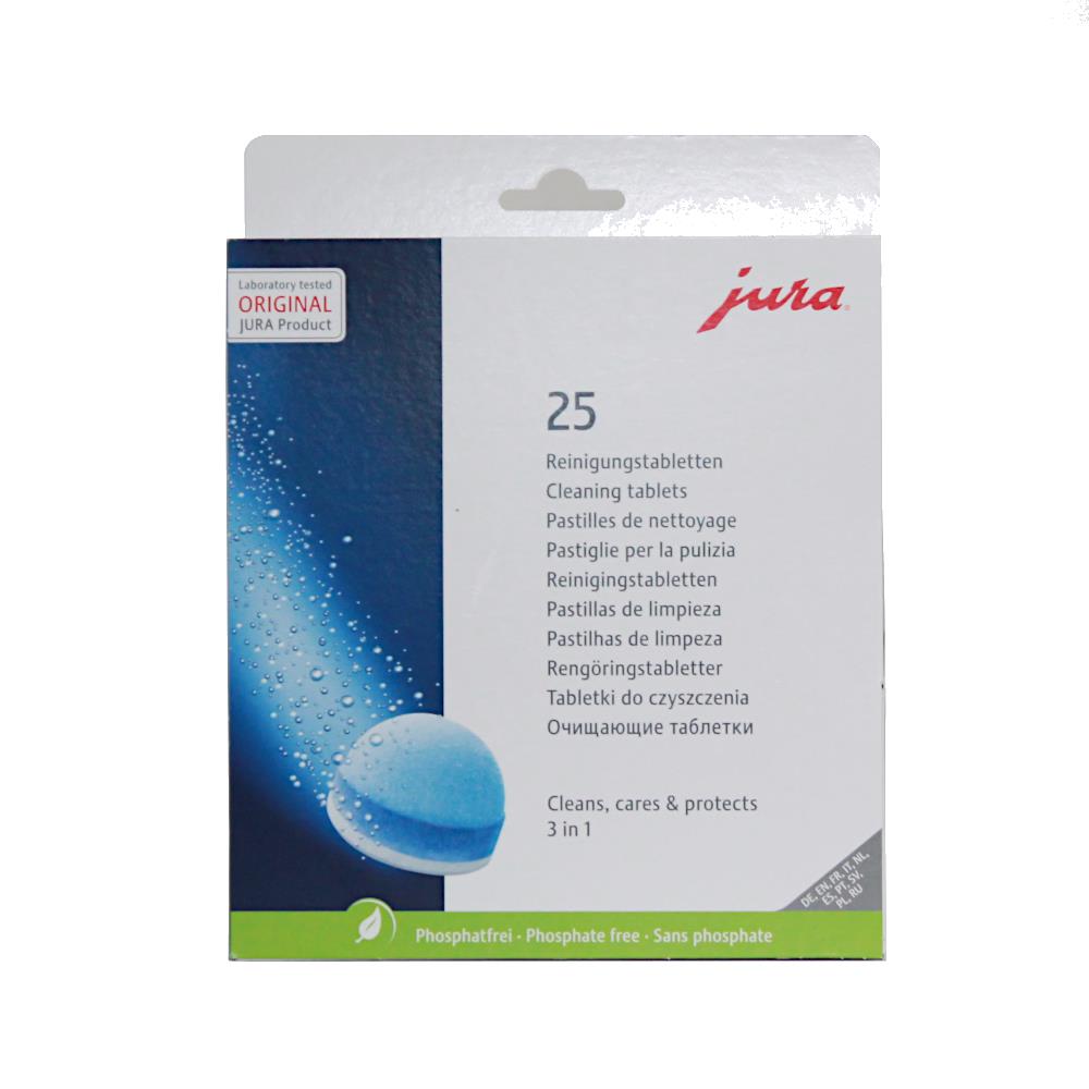 JURA Reinigungstabletten 25045 , Neu, in der BlisterpackungEffektive Reinigung, besondere Pflege und nachhaltiger SchutzDamit die Kaffeequalität permanent auf höchstem Niveau bleibt, sind die Pflege des Vollautomaten sowie die Hygiene im Umgang mit Milch, Kaffee und Wasser entscheidend.Jeder Vollautomat von JURA verfügt über eine wartungsfreie Brüheinheit mit Selbstreinigung auf Knopfdruck.Die phosphatfreie 3-Phasen-Reinigungstablette reinigt, pflegt und schützt den Jura-Vollautomaten. Mit der neuen Pflegephase wurde die JURA Reinigungstablette noch intensiver vorangetrieben.ReinigungsprozessDas Reinigungsprogramm startet ganz einfach auf Knopfdruck. Phase I, die Reinigung:Die spezielle Formel löst effektiv Kaffeefett und Kaffeepartikel in der Brüheinheit und dem Brühsieb. Dabei werden diese Komponenten sowohl von innen als auch von außen mit 80 °C heißem Wasser gründlich gespült.Phase I…
