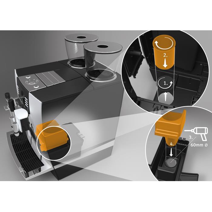 Kaffeesatzabwurf-Set GIGA* Durch die hohe Kapazität des Kaffeesatzbehälters wird ein Leeren nur rund alle 40 Bezüge notwendig. Das Kaffeesatzabwurf-Set macht dies sogar komplett überflüssig. Sorgloser, einfacher und bequemer lässt sich eine ununterbrochene Kaffeespezialitäten-Versorgung nicht gestalten. Dank einer speziellen Konstruktion des Kaffeesatzbehälters wird der Kaffeesatz durch die Bodenplatte geleitet. Die dazu notwendige Bohrung der Tisch-, bzw. Küchenplatte sind im Serviceumfang nicht enthalten. Anleitungen zu den Bohrungen für das Kaffeesatzabwurf-Set GIGA entnehmen Sie der technischen Dokumentation Ihres Vollautomaten. Der anschliessende, technische Umbau ist vom autorisierten JURA-Partner schnell vorgenommen. * Optional bei GIGA Xc und X Modellen Lieferumfang …