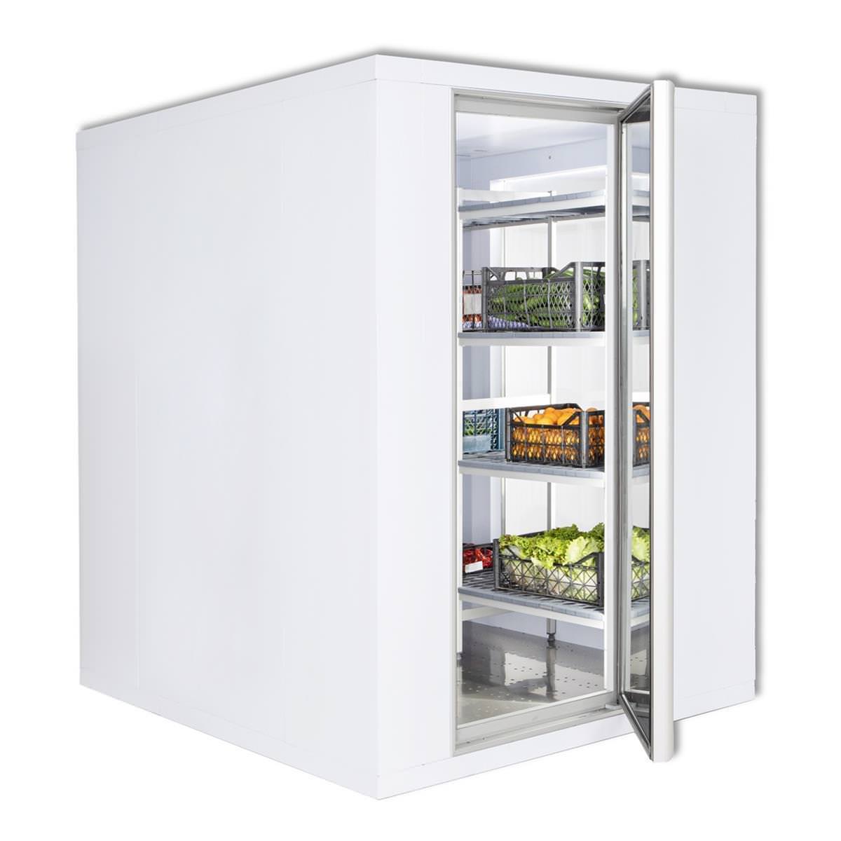 Kühlzelle / Kühlhaus 80 mm – 2100 x 1800 x 2010 mm ohne Kühlaggregat Innenraum mit zusätzlicher PVC-Beschichtung Farbe: weiß Isolierung: Polyurethan-Schaum 80 mm Edelstahl Zellenboden AISI430 (rutschfest) Leichte Reinigung Einfacher Aufbau durch Paneel-System Tür abschließbar mIt Sicherheitsverschluss Türschwelle aus Edelstahl Tür mit Anschlag rechts (wechselbar) Lichtes Türmaß: 1.845 x 700 mm Türdichteprofil: PVC Silikondichtungen Inklusive Beleuchtung statische Belastung: 2000kgf/m2 Material entspricht Nahrungsmittel-Normen Produkt nach ISO9001 zertifiziert modulare Wand- und Deckensegmente aus verzinktem Stahlblech mit Polymerbeschichtung Kapazität: 5,9 m³ Bruttogewicht: 349 KG