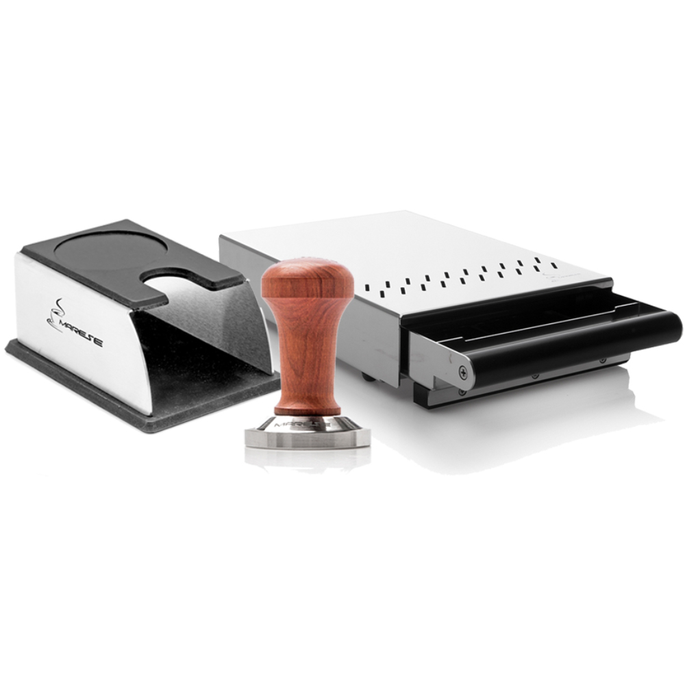 Marese Siebträger SetUnsere Hausmarke Espresso Marese1x Marese Tamperstation1x Marese Tamper, Nussholzgriff1x Marese Sudschublade ""Slim""Marese Siebträger Set Espresso Marese bietet exklusives Zubehör für Ihren Siebträger. Mit diesem Set gelingt die Zubereitung Ihres perfekten Espresso im Handumdrehen.Der Tamper mit einer 58mm plan Base sorgt für ein gleichbleibendes Anpressergebnis. Der Nussholzgriff ist edel verarbeitet.Die Tamperstation ist dafür konzipiert, dass alle möglichen Marken von Filterhaltern komfortabel bedient werden können.Und zuletzt sorgt die Sudschublade dafür, dass Sie das Kaffeemehl leicht und sauber entsorgen können.Lieferumfang1x Marese Tamperstation1x Marese Tamper, Nussholzgriff1x Marese Sudschublade ""Slim""