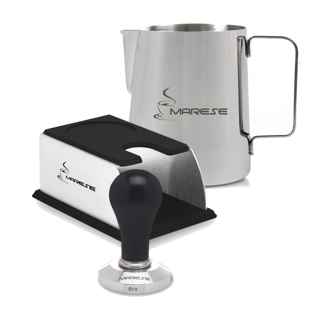 Marese Zubehör Set ""Classic""Unsere Hausmarke Espresso Marese1x Marese Tamperstation classic1x Marese Tamper, kurz, plan, 58mm1x Marese Milchkännchen, 600mlMarese Zubehör Set ""Milch""Espresso Marese bietet exklusives Zubehör für Ihren Siebträger. Mit diesem Set gelingt die Zubereitung Ihres perfekten Espresso im Handumdrehen. Der Tamper sorgt für eine glatte Oberfläche im Filterhalter. Die Tamperstation ist dafür konzipiert, dass alle möglichen Marken von Filterhaltern komfortabel bedient werden können.Mit dem edlen, 600ml fassendem, Milchkännchen von Espresso Marese gelingen Milchgetränke wie Cappuccino und Co. im Hand umdrehen.Lieferumfang1x Marese Tamperstation1x Marese Tamper, kurz, plan, 58mm1x Marese Milchkännchen 600mlUnsere Hausmarke Espresso MARESEZubereitet mit exklusivem Zubehör für Ihren Siebträger. Lernen Sie unsere neuen Marese Produkte kennen.