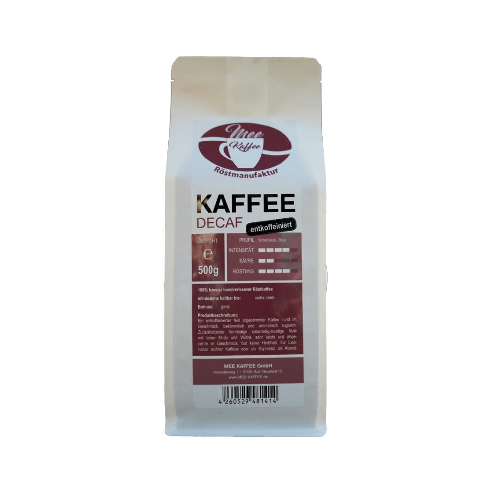 Mee Kaffee DecafIntensität:Säure:Röstung:Profil:Schokolade, ZitrusMee Kaffee DecafMee Kaffee ""Decaf"" ist ein entkoffeinierter, fein abgestimmter Kaffee, rund im Geschmack, aromatisch zugleich. Er hat eine zurückhaltende, feinröstige, karamellig-nussige Note, mit feiner Milde und Würze, ist sehr leicht und angenehm im Geschmack und hat fast keine Herbheit. Dank der sorgsam zusammengestellten Arabica-Mischung wird jede Tasse ""Decaf"" zu einem echten Genuss.Der Mee Kaffee ""Decaf"" ist als entkoffeinierter Kaffee ideal für Liebhaber leichter Kaffees – oder Sie gönnen ihn sich einfach als Espresso am Abend. Dabei ist es gleich, ob Sie Ihren Kaffee am liebsten mit dem Kaffeevollautomaten oder ganz klassisch mit dem Siebträger zubereiten.ZubereitungsempfehlungenAm besten geeignet für:Cafe CremeEspressoLieferumfang: 1.000g Kaffeebohnen