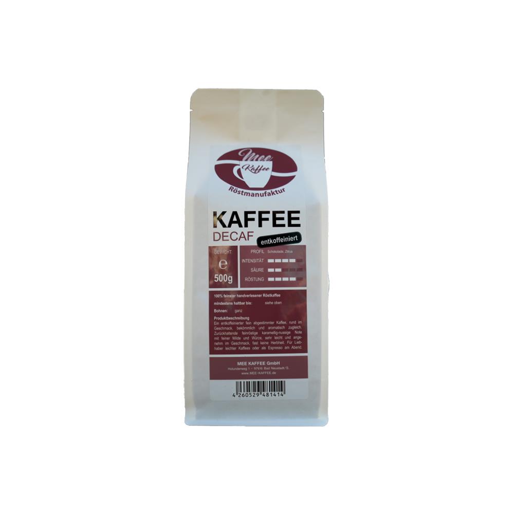 Mee Kaffee Decaf 500gIntensität:Säure:Röstung:Profil:Schokolade, ZitrusMee Kaffee Decaf 500gMee Kaffee ""Decaf"" ein entkoffeinierter fein abgestimmter Kaffee, rund im Geschmack, aromatisch zugleich. Zurückhaltende, feinröstige, karamellig-nussige Note, mit feiner Milde und Würze, sehr leicht und angenehm im Geschmack, fast keine Herbheit. Für Liebhaber leichter Kaffees oder als Espresso am Abend.ZubereitungsempfehlungenAm besten geeignet für:EspressoCafe CremeLieferumfang: 500g Kaffeebohnen