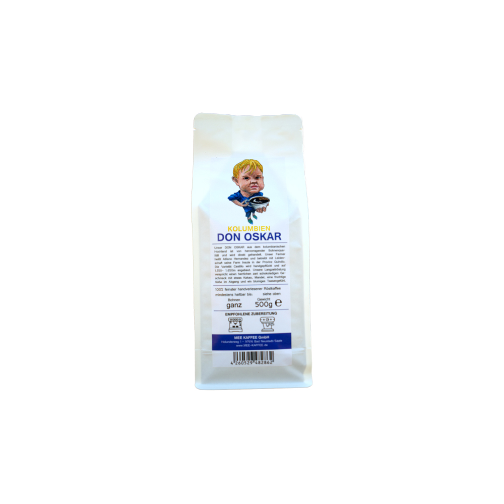 Mee Kaffee Don Oskar Kolumbien 500gIntensität:Säure:Röstung:Profil:Kakao, Mandel, Nuss, PfirsichMee Kaffee Don Oskar Kolumbien 500gDer Mee Kaffee DON OSKAR aus dem kolumbianischen Hochland ist von hervorragender Qualität und wird direkt gehandelt. Der Farmer Atilano Hernandez betreibt mit Leidenschaft seine Farm Insula in Quindio. Die Varietät Castillo wird handgepflückt und auf 1.550- 1.650m angebaut.ZubereitungsempfehlungenAm besten geeignet für:EspressoMilchspezialitätenLieferumfang: 500g Kaffeebohnen