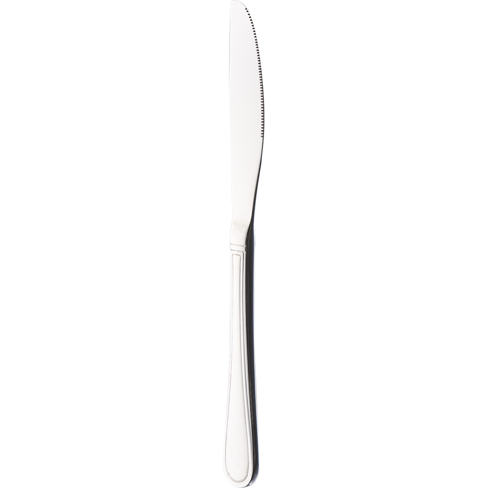 Menümesser RESTAURANT Klassik mit Charakter: Das Menümesser RESTAURANT bringt das traditionsreiche Fadenmuster an den Tisch und überzeugt im täglichen Einsatz. Der umlaufende Dekor rahmt das strahlend glänzende Heft, die klare Linienführung passt zu modernen wie klassischen Services. Gefertigt aus Edelstahl 18/10 ist das Messer spülmaschinengeeignet, hygienisch und für reibungslose Abläufe in Service und Spülküche ausgelegt. Produktdetails Länge: 210 mm Material: Edelstahl 18/10 (INOX) Design: klassischer Fadendekor, klare, lineare Form Pflege: spülmaschinengeeignet, leicht zu polieren Prozesse: geeignet für automatische Besteckabnahme Verkauf: Preis pro Stück; Verkauf in Verpackungseinheiten; Maßangaben können leicht abweichen Vorteile auf einen Blick Zeitlos & kombinierbar: passt zu vielen Porzellan- und Glasserien Alltagstauglich: robuste Qualität für hohe Frequenzen im Einsatz Hygienisch & effizient: einfache Reinigung, schnelle Turnarounds Seriengerecht: abgestimmt mit RESTAURANT-Gabeln, -Löffeln, Kaffee- & Moccakellen Einsatzbereiche Gastronomie & Hotellerie: Restaurant, Hotel, Bistro, Bankett Gemeinschaftsverpflegung & Catering: zuverlässig, langlebig, wirtschaftlich Privat: hochwertige Basis für ein stimmiges Tafelbild Setzen Sie auf ein Messer, das klassische Eleganz und verlässliche Performance vereint – das Menümesser RESTAURANT macht jeden Gang souverän servierbar.