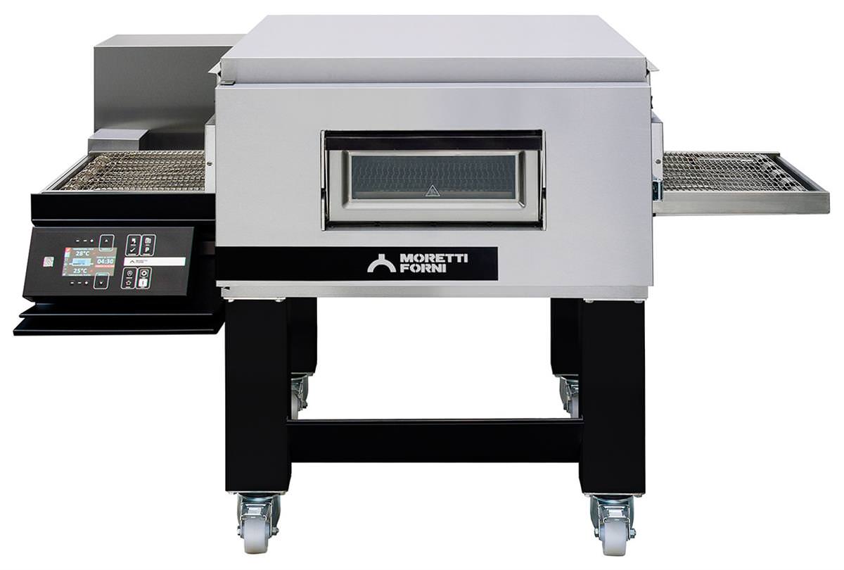 MORETTI Elektro Tunnelofen / Bandofen T75E MORETTI Professional Tunnelofen der Hochleistungsserie T, Modulsystem für bis zu 3 Backkammern übereinander stapelbar mit Elektroanschluss in 4 Leistungsstufen / Bandbreiten, Gasmodelle auf Anfrage Edelstahl-Transportband mit gleichmäßiger Spannung und elektronischer Kontrolle der Bandgeschwindigkeit, Bandbreite 500 mm innen und außen aus Edelstahl Edelstahlgebläse mit einstellbarem Luftvolumen DUAL-TEMP Technologie: Arbeitstemperatur getrennt für Ober- und Unterhitze elektronisch regelbar bis max. 400 °C schnelle Aufheizzeit elektronische Bedieneinheit für Start / Stopp, Timer, Ober- / Unterhitze mit zwei Thermoelementen Programmspeicher (20 Programme) mit Economy-Energiesparfunktion, Fehlerdiagnose und Fehlermeldungsdisplay thermisch gedämmte Hitzeisolierung COOL-AROUND Technologie: Seitentür mit Fenster aus temperiertem Glas Erwärmung der Seitentür aus Sicherheitsgründen auf nur max. +38 °C wartungs- und reinigungsfreundlich: Frontpaneel abnehmbar, Heizelemente durch seitliche Türen leicht erreichbar (Elektroversion), Frontzugang zum Maschinenfach, Transportbandeinheit vollständig herausnehmbar Maße außen: (B x T x H): 1810 x 1261 x 560 mm , mit Fahrgestell (H): 1160 mm mögliches Fassungsvermögen: 48 x Pizzen mit Ø 33 cm pro Stunde, 25 x Pizzen mit Ø 45 cm pro Stunde, 22 x Pizzablech(e) 600 x 400 mm pro Stunde Arbeitstemperatur: 25 bis 400 °C Energieverbrauch: 8,3 kWh pro Betriebsstunde Anschlusswert Elektro: 16,55 kW / 3N / 400 V Bruttogewicht: 239 kg Nettogewicht: 214 kg Hinweis: Laufrichtung bedienseitig von links nach rechts vorgegeben, ab Werk wechselbar. Entgegengesetzte Richtung bitte bei Bestellung angeben.
