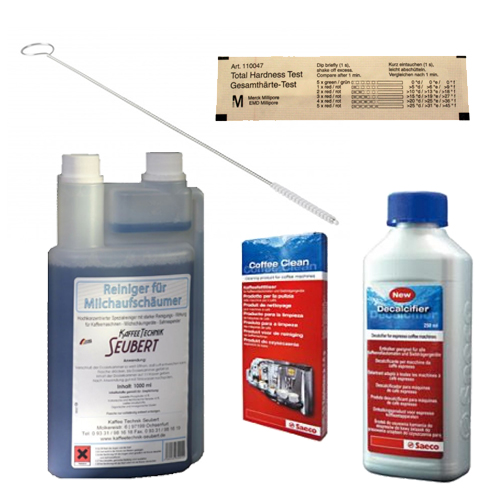 Dieses 5-teiliger Pflege- und Reinigungsset ""Saeco"" ist die ideale Ergänzung zum Kauf Ihres neuen Saeco Kaffeevollautomaten. Es enthält eine komplette Grundausstattung an Reinigungsmitteln und -zubehör für die ersten Reinigungen Ihres neuen Kaffeevollautomaten.Die Basics zur Pflege Ihres Saeco KaffeevollautomatenDamit Sie besser abschätzen können in welchen zeitlichen Abständen die regelmäßige Reinigung ihres Saeco-Kaffeevolautomaten durchgeführt werden muss, haben wir diesem Set einen Teststreifen für die Wasserhärte beigefügt.Dabei gilt: Je höher die Wasserhärte, desto größer die Gefahr einer Kalkablagerung, desto kürzer die Abstände in denen Sie mithilfe des in diesem Set enthaltenen Saeco Entkalkers Decalcifier eine Entkalkung durchführen müssen.Das Saeco Pflege- und Reinigungsset Basic besteht aus:1x Teststreifen für die Wasserhärte1x Milchschaumreiniger Inhalt 1000 ml1x Reinigung…