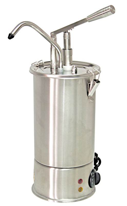 Soßenspender beheizbar Dosierspender beheiztes Warmhaltegerät mit Hebelbedienung Auslauf schwenkbar Antitropftülle zylindrischer Behälter aus Edelstahl mit Klammern Dosierung einstellbar (40ml) Thermostat stufenlos einstellbar von 0-120°C Anzeige mit Kontrollleuchte Leistung: 230V, 50Hz speziell für Kuvertüre, Suppen, Saucen und Dips. Höhe: 624 mm Durchmesser: Ø 180 mm Volumen: 3,0 Liter