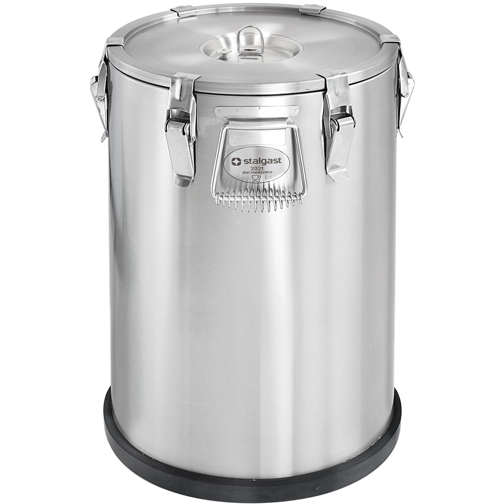 Thermobehälter aus rostfreiem Edelstahl 35 Liter zum Transportieren und Warmhalten von Speisen  Deckel mit Silikondichtung  Doppeldeckel ist resistent gegen Abnutzung der Silikondichtung  Sechs Spannverschlüsse  Ergonomische Griffe  Boden mit Gummischutzring  Entlüftungsventil zur Beseitigung von Druckunterschieden  Durch die doppelten Wände und die spezielle Schaumisolierung können Speisen bis zu acht Stunden warmgehalten werden  stapelbar Fassungsvermögen: 35 Liter