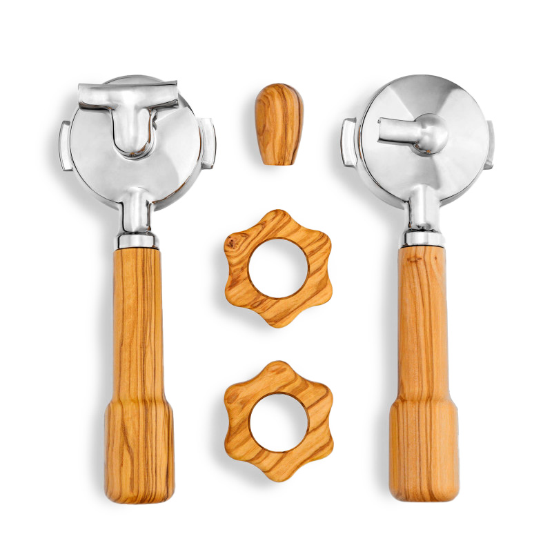 Griffset classic Drehräder universal 5-tlg Olive Griffset bestehend aus: 1x Siebträger classic 1er VA, 1x Siebträger classic 2er VA und 2x Drehrad universal M14 mit 1x Kipphebel universal. Passend für: Lelit Mara und Bianca, Rocket Cellini evo v2, Profitec Pro500, Pro 600, Pro700.Maße: 32x25x8 cmLieferumfang: 1x Griffset classic