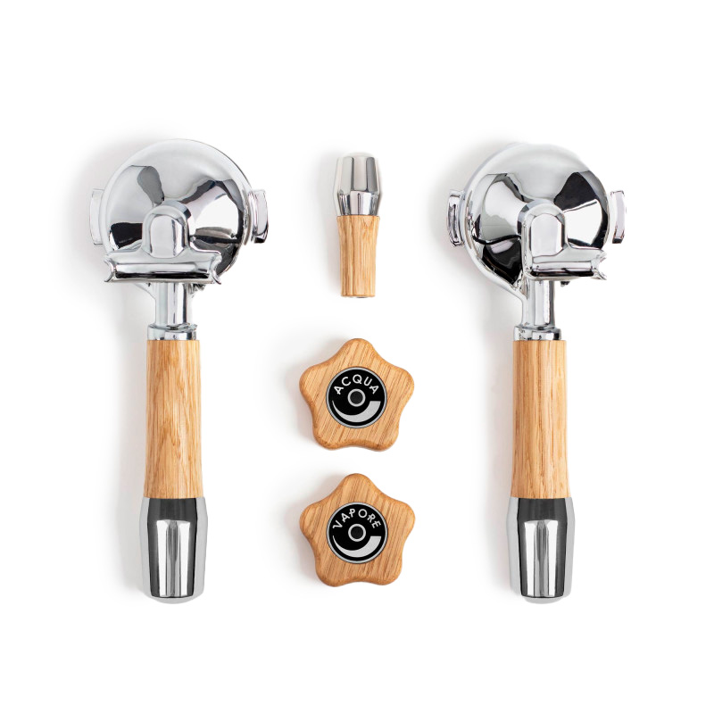 Griffset elegant für ECM mit Drehrädern Eiche Griffset bestehend aus: 1x Siebträger elegant Chrom ECM 1er, 1x Siebträger elegant Chrom ECM 2er und 2x ECM-Drehrad mit ECM-Bezugshebel. Passend für: ECM Technika/Mechanika IV und Mechanika SlimMaße: 32x25x8 cmLieferumfang: 1x Griffset für ECM