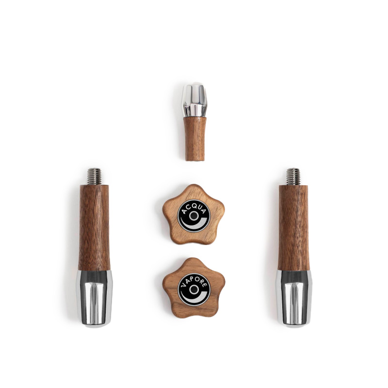 Griffset elegant für ECM mit Drehrädern Nussbaum Griffset ohne Siebträgerköpfe bestehend aus: 2x Siebträgergriffstück elegant, und 2x ECM-Drehrad mit ECM-Bezugshebel. Passend für: ECM Technika/Mechanika IV und Mechanika SlimMaße: 27x20x4,5 cmLieferumfang: 1x Griffset für ECM (ohne Siebträgerköpfe)