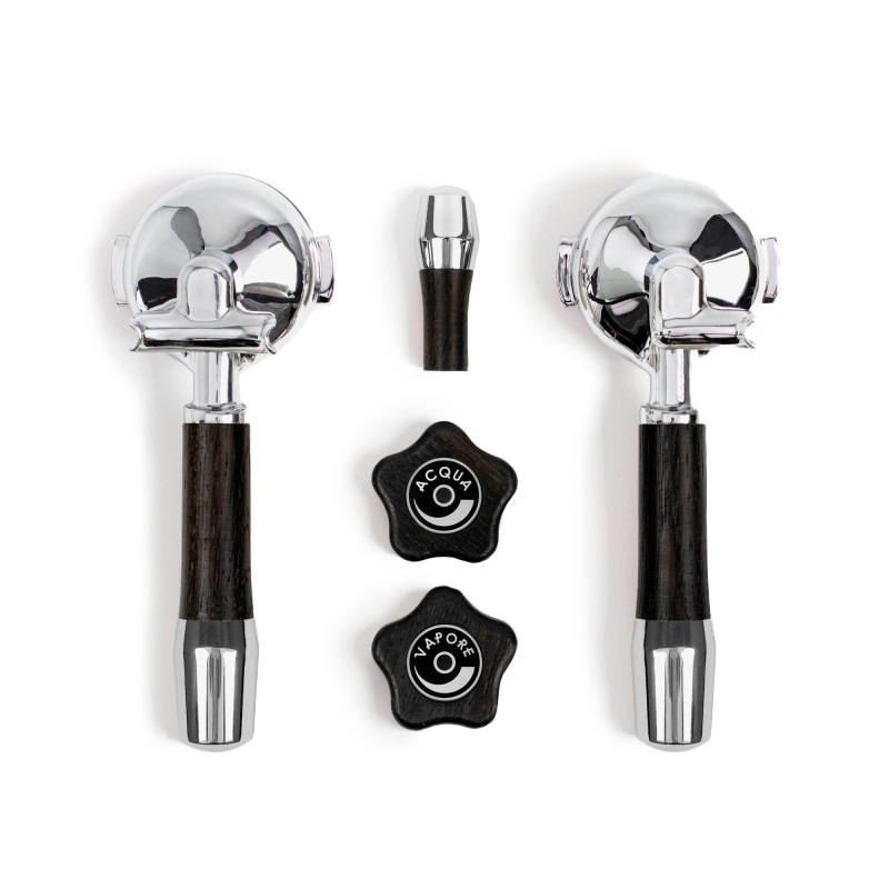 Griffset elegant für ECM mit Drehrädern Räuchereiche Griffset bestehend aus: 1x Siebträger elegant Chrom ECM 1er, 1x Siebträger elegant Chrom ECM 2er und 2x ECM-Drehrad mit ECM-Bezugshebel. Passend für: ECM Technika/Mechanika IV und Mechanika SlimMaße: 32x25x8 cmLieferumfang: 1x Griffset für ECM