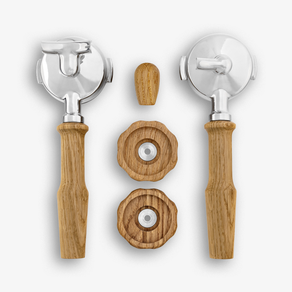 Wiedemann Griffset vibrant Rocket Appartamento TCA EicheGriffset bestehend aus: 1x Siebträger vibrant Edelstahl 1er, 1x Siebträger vibrant Edelstahl 2er, 2x Rocket-Drehrad TCA, 1x universal Kipphebel. Passend für: Rocket Appartamento TCA ab BJ 2023Lieferumfang: 1 x Griffset
