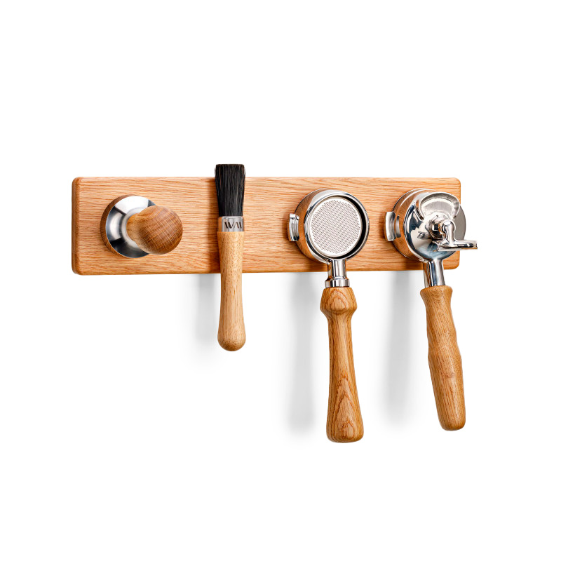 Hangup® 4 Eiche Das Hangup® 4 bietet vier Magnetplätze an denen unterschiedliche Produkte aufgehängt werden können. Das Hangup® kann an die Wand geschraubt oder geklebt werden. Ideal zum Aufhängen von Siebträger (mit Puck®) Präzisionstamper (•) und Baristapinsel.Maße: 630x150x40 cmLieferumfang: 1x Hangup