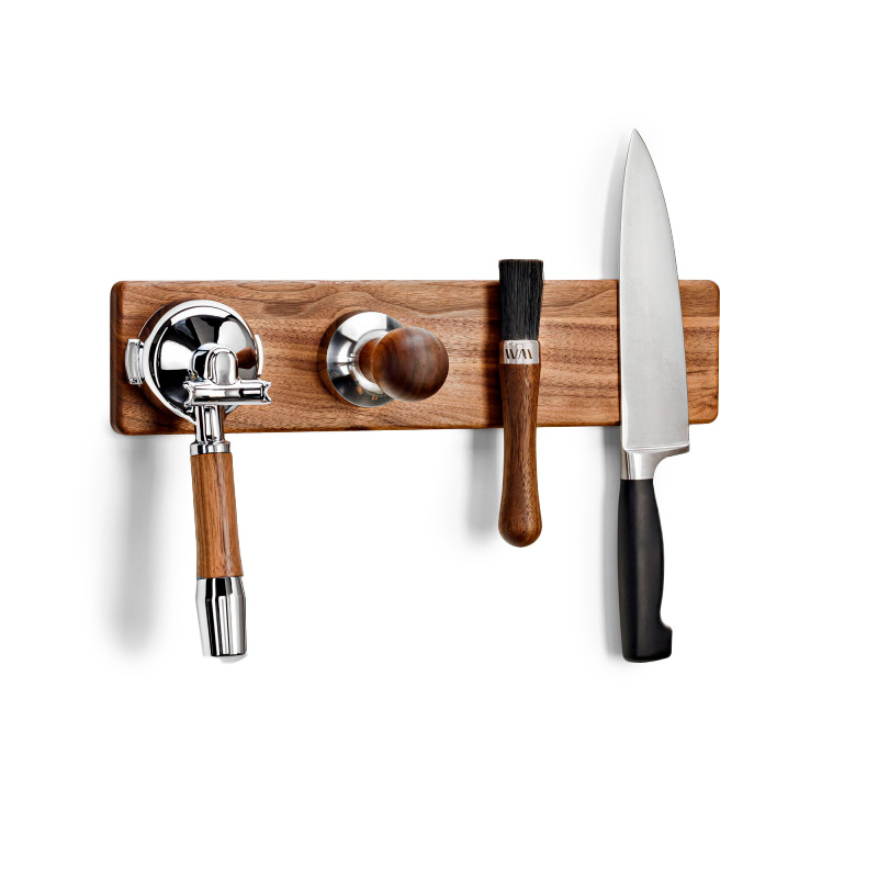Hangup® 4 Nussbaum Das Hangup® 4 bietet vier Magnetplätze an denen unterschiedliche Produkte aufgehängt werden können. Das Hangup® kann an die Wand geschraubt oder geklebt werden. Ideal zum Aufhängen von Siebträger (mit Puck®) Präzisionstamper (•) und Baristapinsel.Maße: 630x150x40 cmLieferumfang: 1x Hangup