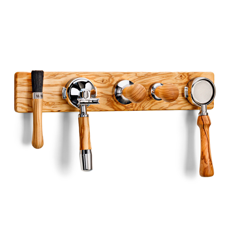 Hangup® 5 Olive Das Hangup® 5 bietet fünf Magnetplätze an denen unterschiedliche Produkte aufgehängt werden können. Das Hangup® kann an die Wand geschraubt oder geklebt werden. Ideal zum Aufhängen von Siebträger (mit Puck®) Präzisionstamper (•) und Baristapinsel.Maße: 630x150x40 cmLieferumfang: 1x Hangup