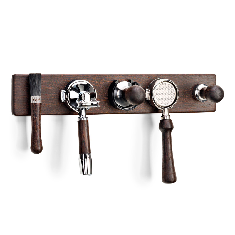 Hangup® 5 Räuchereiche Das Hangup® 5 bietet fünf Magnetplätze an denen unterschiedliche Produkte aufgehängt werden können. Das Hangup® kann an die Wand geschraubt oder geklebt werden. Ideal zum Aufhängen von Siebträger (mit Puck®) Präzisionstamper (•) und Baristapinsel.Maße: 630x150x40 cmLieferumfang: 1x Hangup