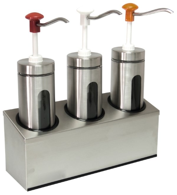Zylindrischer Soßenspender mit Sichtfenster 3x 2 Liter Dosierspender rund mit Sichtfenster zylindrischer Glasbehälter mit Edelstahlhülle Behälter: 3x 2 Liter    Durchmesser: Ø 100mm Maße: 443 x 147 x 465 mm (BxTxH) mit Druckknopf-Bedienung Dosierung einstellbar (30ml) benutzerfreundlich und hygienisch